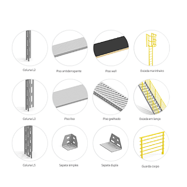 Podem possuir gavetas, divisores, portas e fechamento com chapas laterais e de fundo. Permitem a utilização de pisos intermediários duplicando a capacidade de armazenagem.