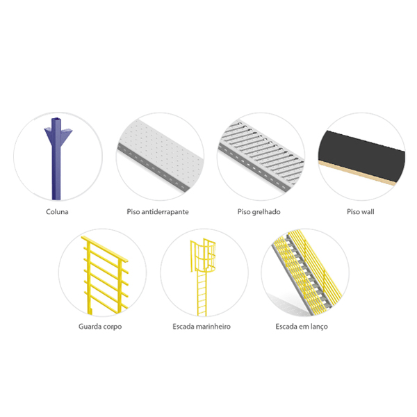 Sistema que permite o aumento da área através da inclusão de um ou mais níveis de utilização com revestimento em placas de aço lisas, antiderrapantes ou grelhadas (vazadas), em placas de manta fenólica, madeira, etc. Com sistemas de montagem através de parafusos podem ser removidos com facilidade em caso de mudança.