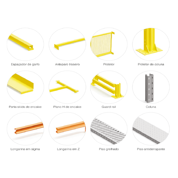 Este sistema permite alta seletividade, ideais para cargas diversificadas. Cada palete é acondicionado em um compartimento designado, permitindo o acesso a ele sem movimentar outro palete. Os acessórios complementam as necessidades de armazenagem e ampliam sua forma de utilização.